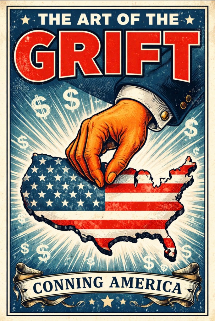 a grift is a hustle or scam, often involving someone (a grifter) who profits by dishonestly persuading or conning people, frequently through elaborate stories or fake beliefs (like pseudoscience or political outrage) for money, donations, or attention, without actually believing what they’re selling- Yeah, that sounds about right..