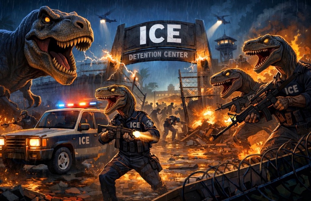 Do you wanna scenario – Jurassic Park- a velociraptor intentionally released without handlers, without a cage. ICE is that raptor: fast, territorial, operating on instinct, surrounded by a pack of lackeys tearing through everything in its path. Authority without judgment, predatory in every aspect.
